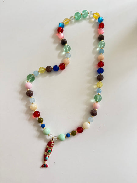 A strand of vibrant, multicoloured beads creates a sun-drenched, nostalgic feel—like summer bottled into jewellery—while a single red diamante fish steals the spotlight. Think a little ironic, a little luxe, and completely unforgettable.